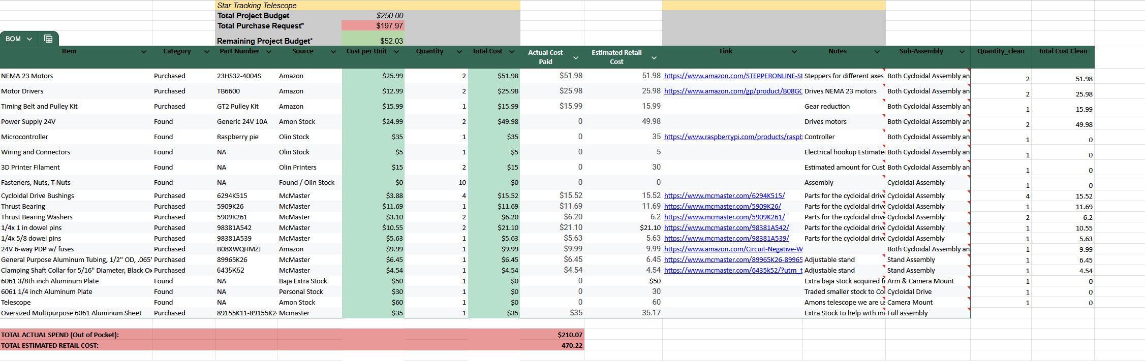 Looking at the budget in detail, the full retail cost of our metal build lands around $570, mostly driven by aluminum 6061 plates, bushings, thrust hardware, and a pair of NEMA-23 motors with TB6600 drivers. The camera used would be around 100 on facebook marketplace, however we got it as a loaner from a team member. If a team wanted a low-cost version, the entire mechanical system can be swapped for 3D-printed PLA/PETG parts, which removes the aluminum plate, stock tubing, and machining consumables. In that configuration, you only pay for the motors, drivers, timing belt, a Raspberry Pi, thrust bearings, filament, wiring, and basic fasteners, roughly $225–$275 using our BOM assumptions. A team with access to a printer and a loaner camera could get even closer to $200 all-in, which means you can reproduce the tracking performance without a machine shop. The value of our final version is rigidity and finish, but the core motion system, gearing, and tracking algorithm work just as well in a fully printed enclosure.